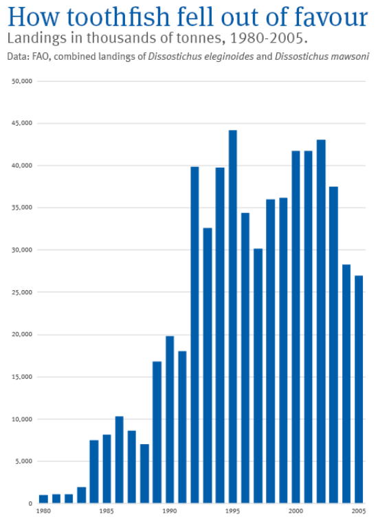 In the 1990’s illegal catches were higher than legal ones and this lead to a campaign to ban Chilean Sea Bass from the menu, with supermarkets stopping the sales of it and more than 700 US chefs working with environmental groups on the campaign to stop the consumption(MSC, 2018).